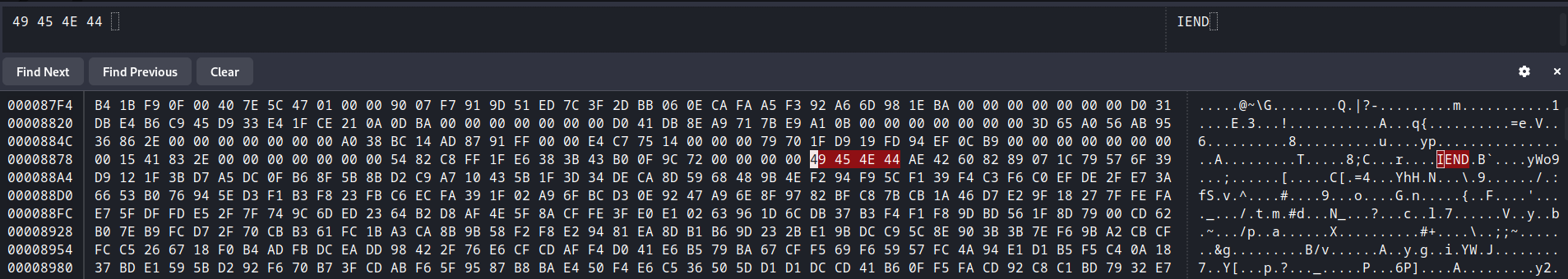 Nous voyons effectivement qu'il y a un souci car nous avons énormément de contenu après la "balise" *IEND* qui normalement signifie la fin de l'image. D'ailleurs un autre *IEND* est bien présent à la fin de cette image.\