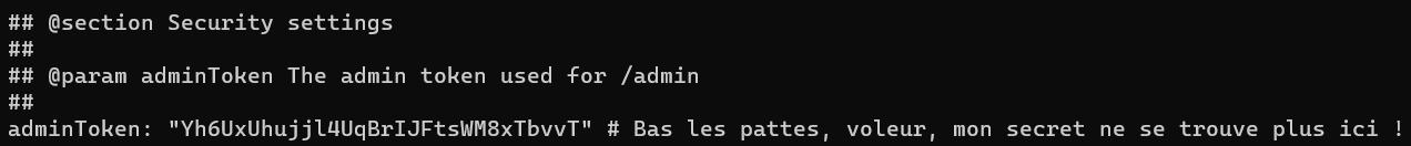 Nous avons le token de l'utilisateur admin. Mais il faut bien faire attention au commentaire juste à côté qui nous alerte sur le fait qu'il ne se trouve plus ici. Il va donc falloir trouver un moyen de le retrouver.