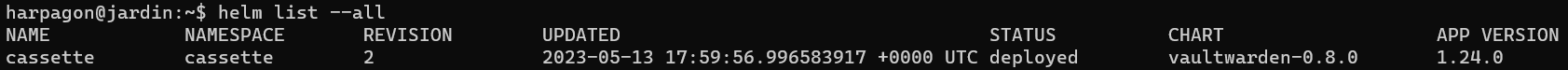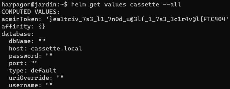 Pour ça, la commande *`helm get values cassette --all`* est parfaite et permet de récupérer l'intégralité des paramètres/valeurs du projet :&#x20;