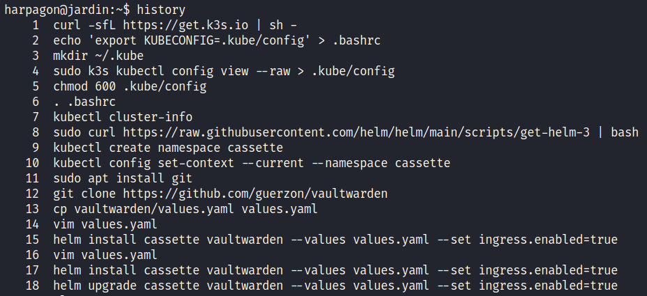 Avec cela nous comprenons qu'il créé un espace avec *`kubectl`* et qu'il installe puis modifie [Bitwarden](https://github.com/guerzon/vaultwarden) à l'aide de *`helm`*.