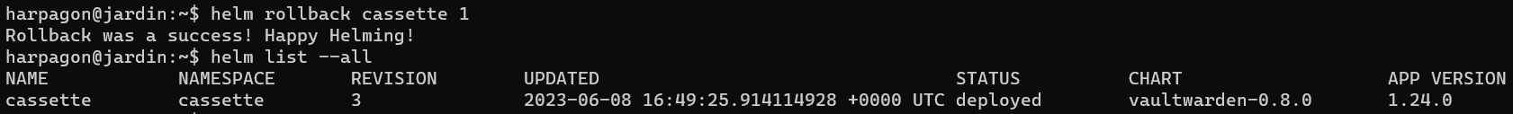 Très rapidement nous trouvons la commande suivante *`helm rollback cassette 1`* :&#x20;