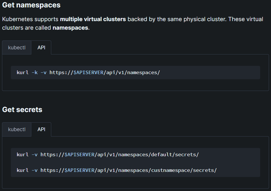 En parcourant la page, j'ai donc trouvé des choses intéressantes. Par exemple nous pouvons lister le nom des [namespaces](https://cloud.hacktricks.xyz/pentesting-cloud/kubernetes-security/kubernetes-enumeration#get-namespaces) existants pour ensuite en extraire les secrets et récupérer éventuellement des infos intéressantes.