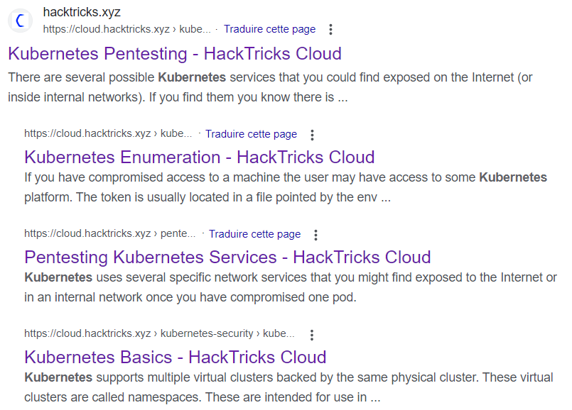 Rien que le [deuxième résultat](https://cloud.hacktricks.xyz/pentesting-cloud/kubernetes-security/kubernetes-enumeration) a l'air très intéressant. Nous pouvons aller voir ce qu'il propose.