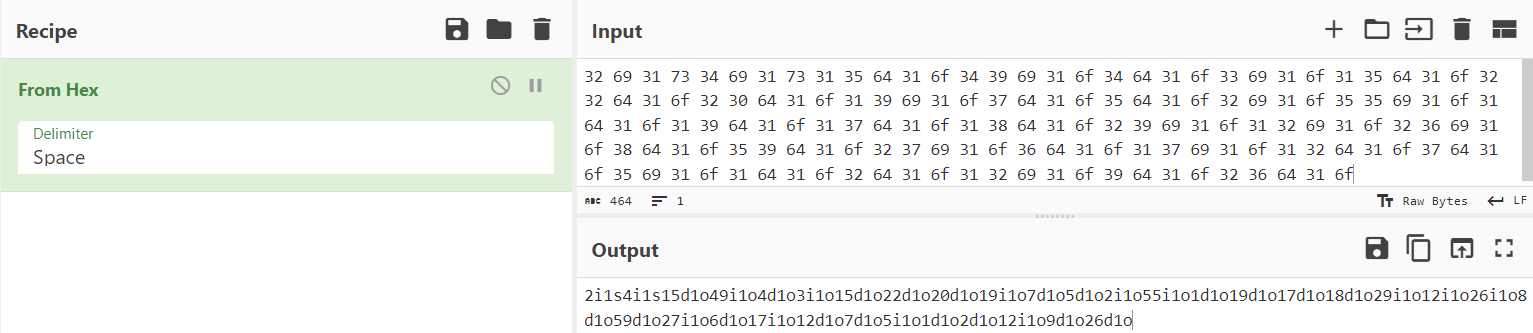 Pour cette étape nous pouvons utiliser très simplement [CyberChef](https://gchq.github.io/CyberChef/#recipe=From_Hex\('Space'\)) qui nous donnera d'ailleurs la "fonction" à utiliser :&#x20;