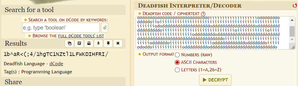 Pour ce faire, nous utilisons cet outil ([dCode - Deadfish](https://www.dcode.fr/deadfish-language)) pour décoder ce bloc : <br>