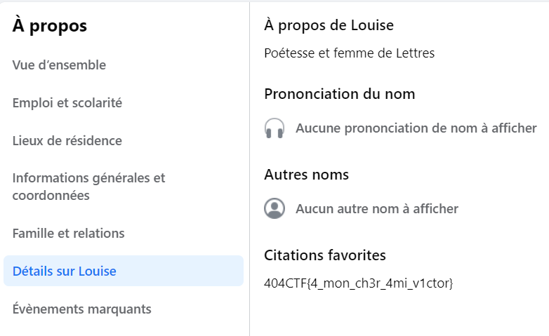 En arrivant sur la page d'accueil du compte, nous pouvons voir 2 "posts" notifiant du changement de sa photo de profil et de couverture. Nous allons donc chercher dans tous les recoins du compte pour finalement arriver au bon résultat dans la rubrique "Détails sur Louise" :
