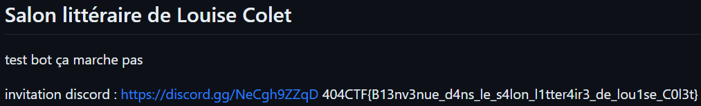 Nous n'avons que 3 résultats, mais 1 est très intéressant et parle juste d'un salon littéraire. En lisant simplement la page d'accueil de ce Github, nous trouvons le flag à la toute fin du fichier README.md.