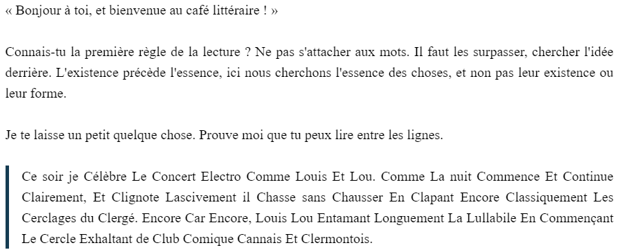 Pour ce challenge d'intro à la stéganographie il fallait bien se creuser la tête pour trouver une logique dans le texte donné.