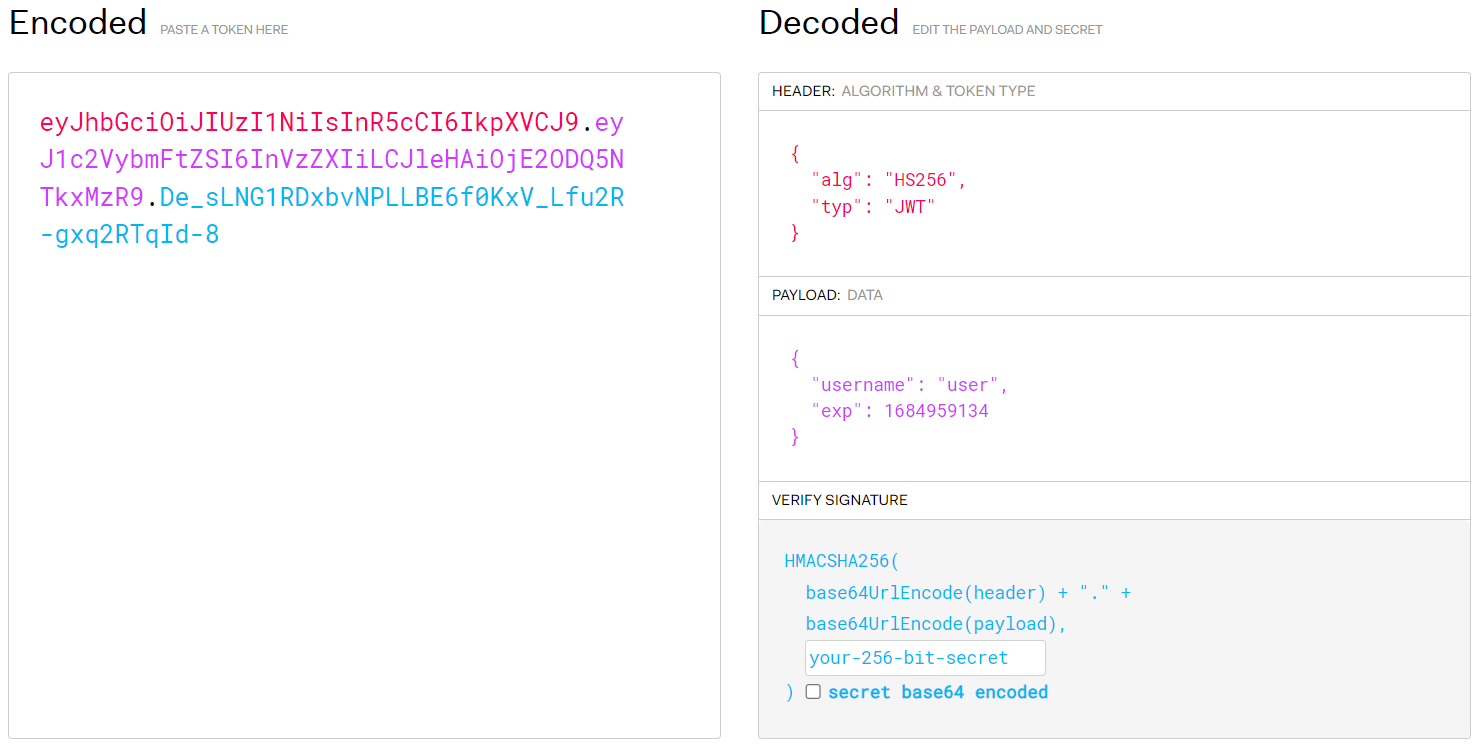 \- Le payload : `eyJ1c2VybmFtZSI6ImFkbWluIiwiZXhwIjoxNjg1NjM2NjIwfQ` (*{"username":"admin","exp":1685636620}*)\