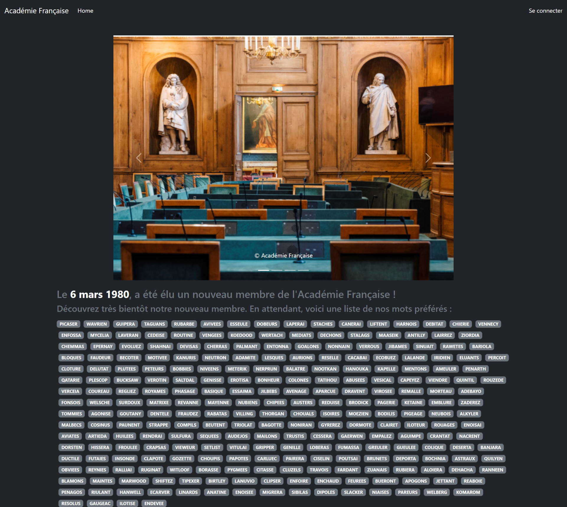 Pour ce challenge de web, nous arrivons sur une page d'accueil avec un carrousel, beaucoup de mots et un espace de connexion.