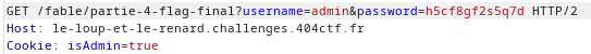Nous mettons donc les infos de connexions dans l'espace spécifique et nous définissons le cookie *isAdmin* à *true* : <br>